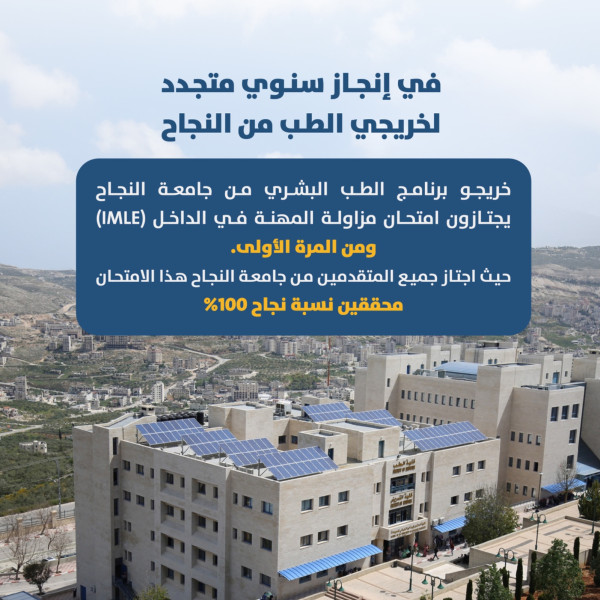 النجاح الإخباري - تمكّن خريجو برنامج الطب البشري في جامعة النجاح من اجتياز امتحان مزاولة المهنة في الداخل (IMLE) ومن المرة الأولى، حيث حقق جميع المتقدمين نسبة نجاح بلغت 100%.