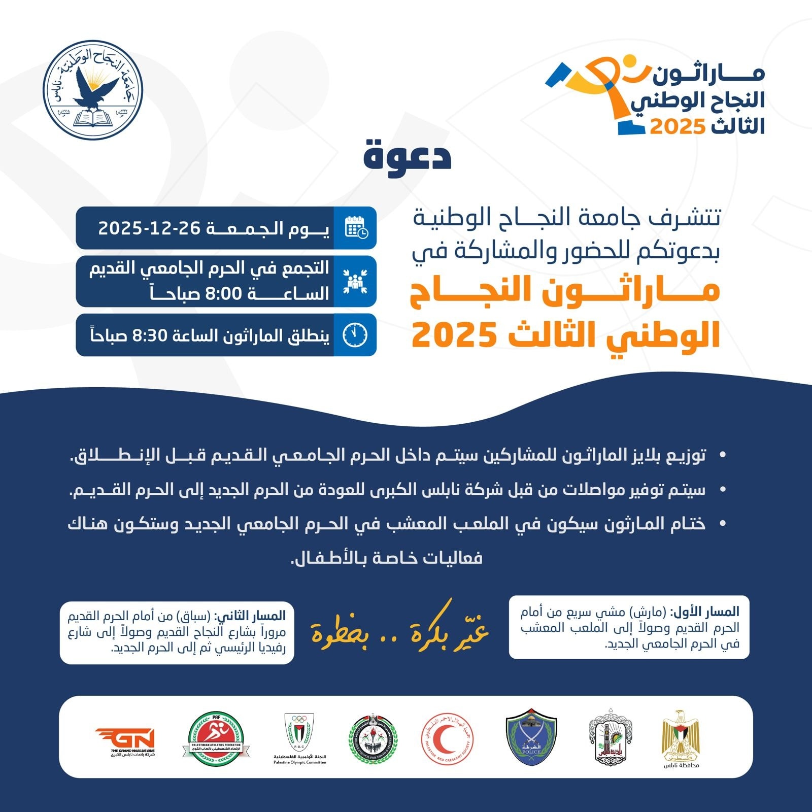 النجاح الإخباري - تستعد جامعة النجاح الوطنية لتنظيم ماراثون النجاح الوطني الثالث 2025، يوم الجمعة الموافق 26 كانون الأول/ديسمبر 2025، بمشاركة واسعة من طلبة الجامعة والعاملين فيها ومؤسسات رسمية ومجتمعية، في فعالية رياضية تحمل أبعادًا صحية ومجتمعية ووطنية.