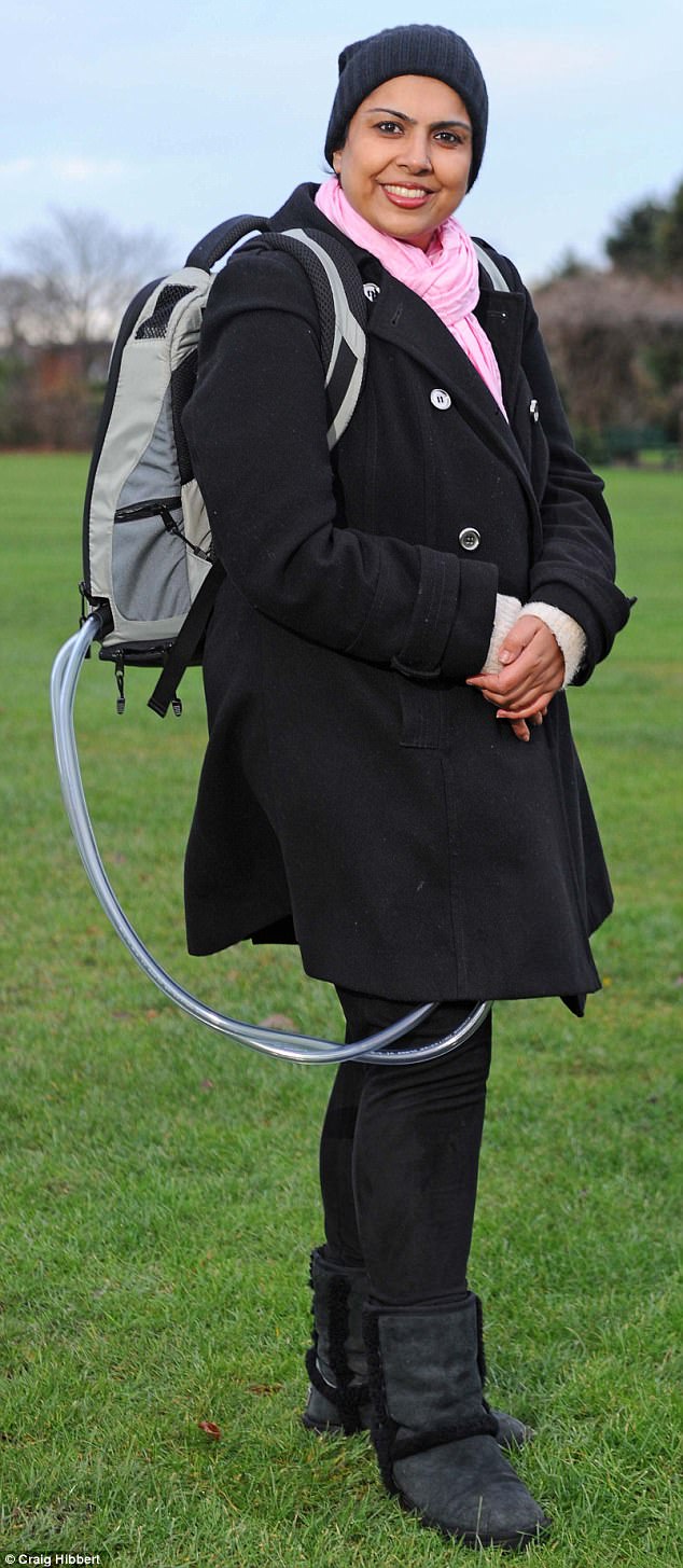 وفي حقيبة ظهرها، تحمل سلوى بطاريات ومحركاً كهربائياً ومضخة تدفع الهواء من خلال أنابيب لتدوير الغرف البلاستيكية في صدرها لتضخّ الدمّ لجسدها.