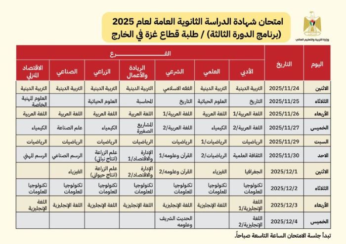 النجاح الإخباري - أعلنت وزارة التربية والتعليم العالي، أن امتحانات الثانوية العامة لعام 2025 (الدورة الثالثة)، لطلبة قطاع غزة ستبدأ يوم الاثنين 24/11/2025 وتنتهي يوم 4/12/2025