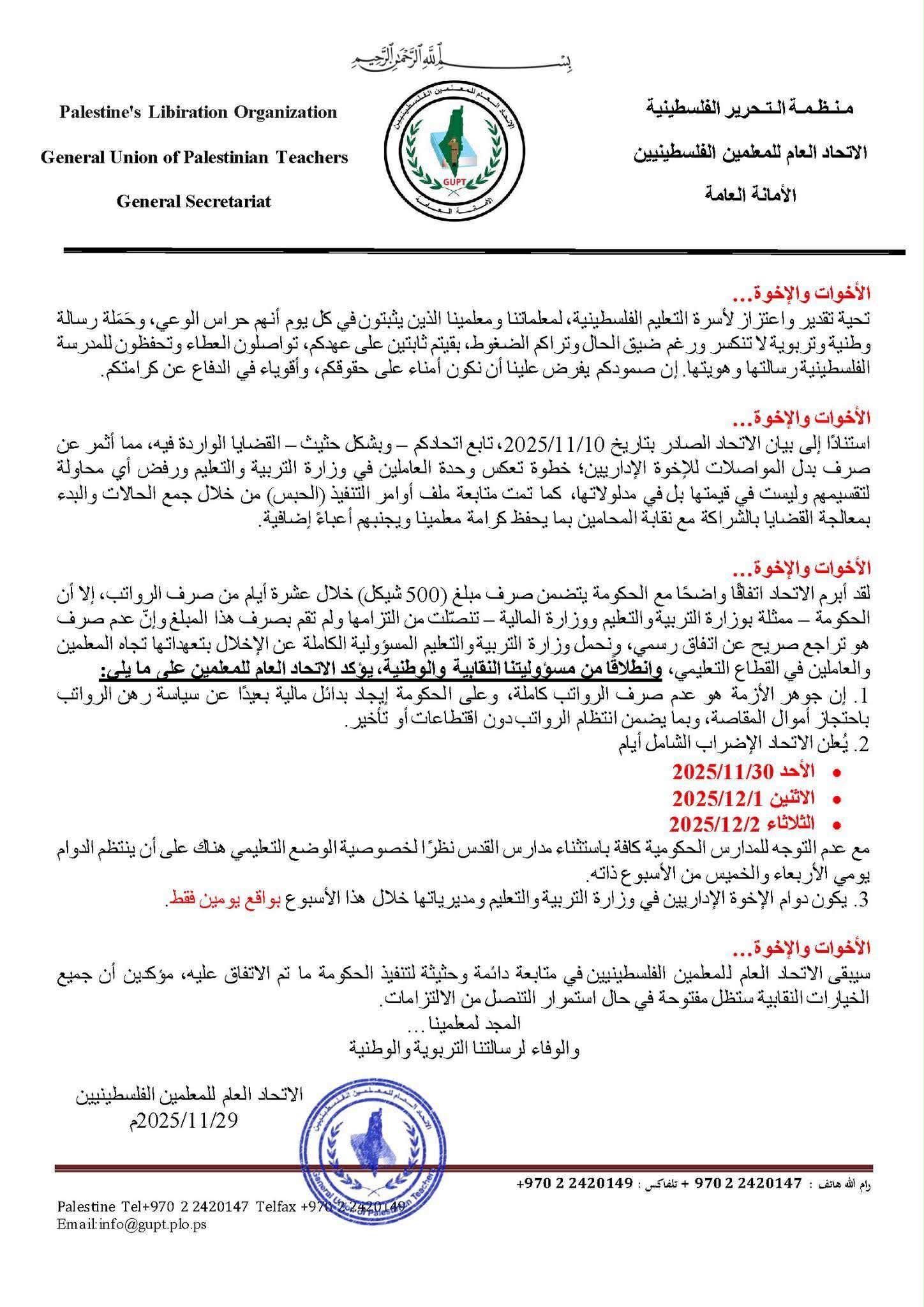 نابلس - النجاح الإخباري - سلسلة خطوات نقابية تصعيدية، تبدأ يوم الأحد 30/11/2025 وتمتد حتى الثلاثاء 2/12/2025، وذلك احتجاجًا على عدم التزام الحكومة بتنفيذ الاتفاق القاضي بصرف مبلغ (500 شيكل) خلال عشرة أيام من صرف الرواتب، وتسديد المستحقات المالية المتراكمة للمعلمين.