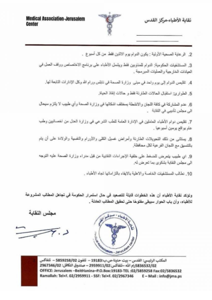 وأوضحت النقابة، أن الحكومة تجاهلت الاتفاقات السابقة التي تم التوصل إليها مع النقابة، واستمرت في سياسة المماطلة والتنصل من التزاماتها، الأمر الذي يحمّلها المسؤولية الكاملة عن تدهور النظام الصحي في البلاد. وأشار إلى أن قرار التقليص في القطاع العام الذي أقرته الحكومة السابقة انعكس بشكل سلبي على صحة المواطنين، وكان الأجدر بالحكومة أن تستثني موظفي وزارة الصحة وأن تبحث عن حلول لتطوير القطاع الصحي في ظل الظروف القاسية التي يواجهها الشعب الفلسطيني.