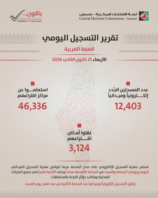 النجاح الإخباري - أعلنت لجنة الانتخابات المركزية أمس الأربعاء عن تسجيل 12,403 مواطنين جدد في سجل الناخبين خلال اليوم الثاني من عملية التسجيل الميداني، فيما قام 3,124 مواطناً بنقل أماكن اقتراعهم أو تعديل بياناتهم في السجل الانتخابي.