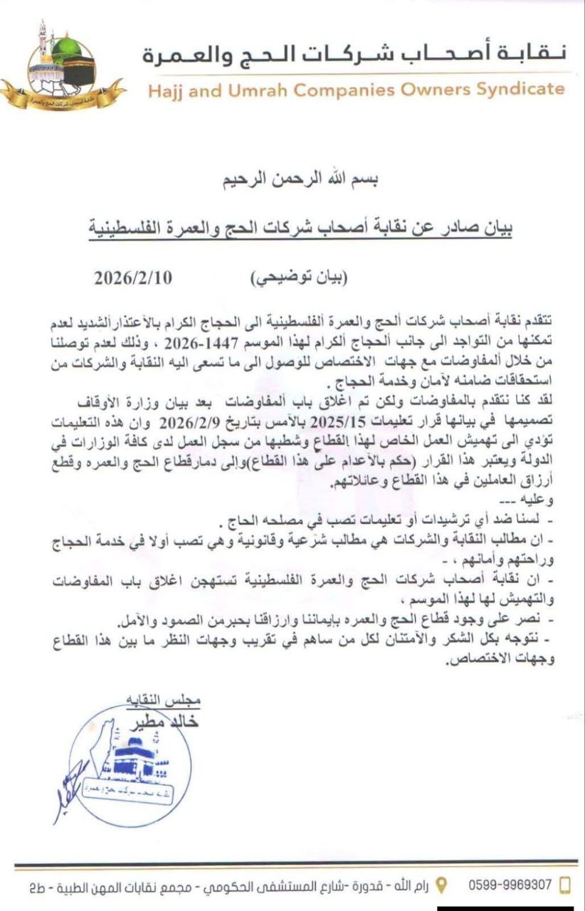 النجاح الإخباري - أصدرت نقابة أصحاب شركات الحج والعمرة الفلسطينية، اليوم الإثنين، بيانًا توضيحيًا أعربت فيه عن اعتذارها الشديد لعدم تمكنها من التواجد إلى جانب الحجاج الكرام خلال موسم الحج 1447هـ / 2026م.