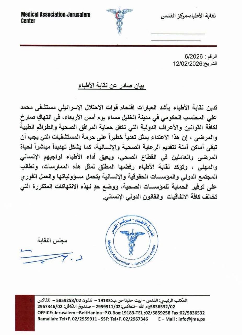وقالت النقابة في بيان صادر عنها بتاريخ 12/02/2026، إن الاعتداء يمثل تعديًا خطيرًا على حرمة المستشفيات التي يجب أن تبقى أماكن آمنة لتقديم الرعاية الصحية والإنسانية، مشيرةً إلى أن مثل هذه الانتهاكات تهدد حياة المرضى والعاملين في القطاع الصحي، وتعيق الأطباء عن أداء واجبهم الإنساني والمهني.