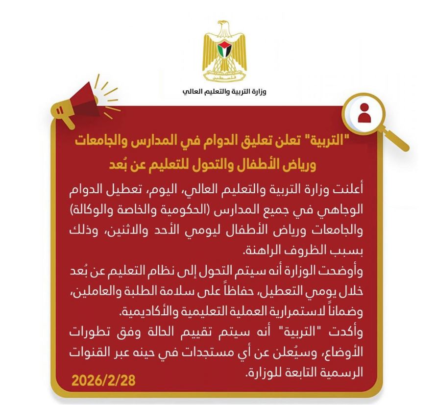 وأكدت "التربية" أنه سيتم تقييم الحالة وفق تطورات الأوضاع، وسيُعلن عن أي مستجدات في حينه عبر القنوات الرسمية التابعة للوزارة.