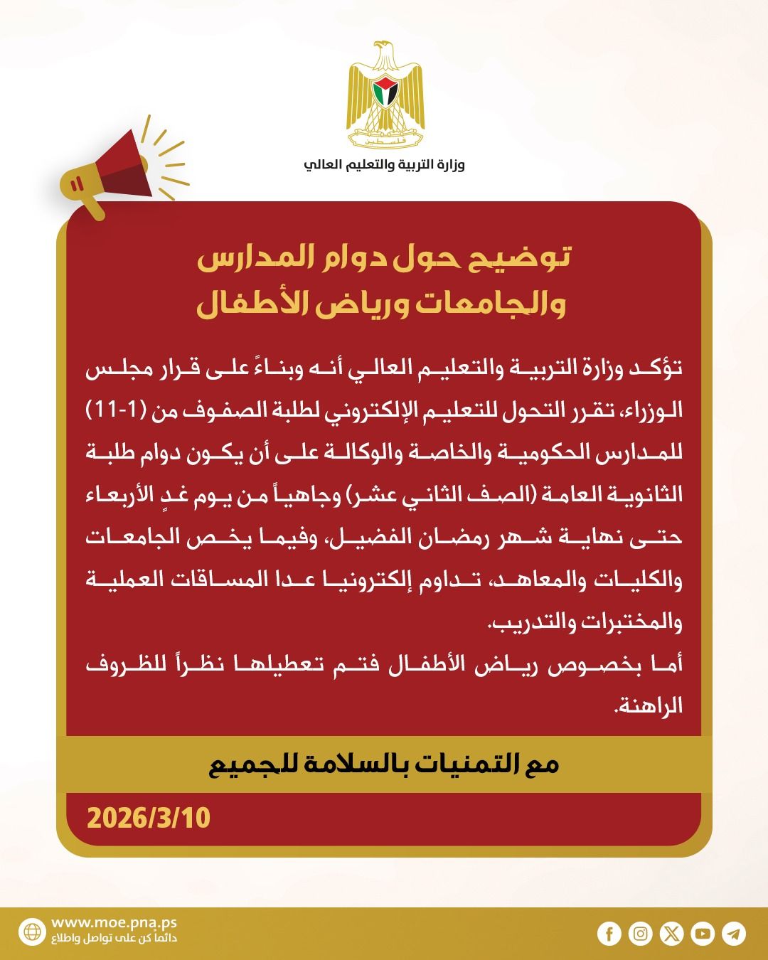 وأوضحت الوزارة، في بيان، أن القرار جاء بناءً على قرار مجلس الوزراء الفلسطيني، ويشمل طلبة الصفوف من الأول حتى الحادي عشر في المدارس الحكومية والخاصة ومدارس الوكالة، حيث سيتم اعتماد التعليم الإلكتروني بدءًا من يوم غدٍ الأربعاء وحتى نهاية شهر رمضان.