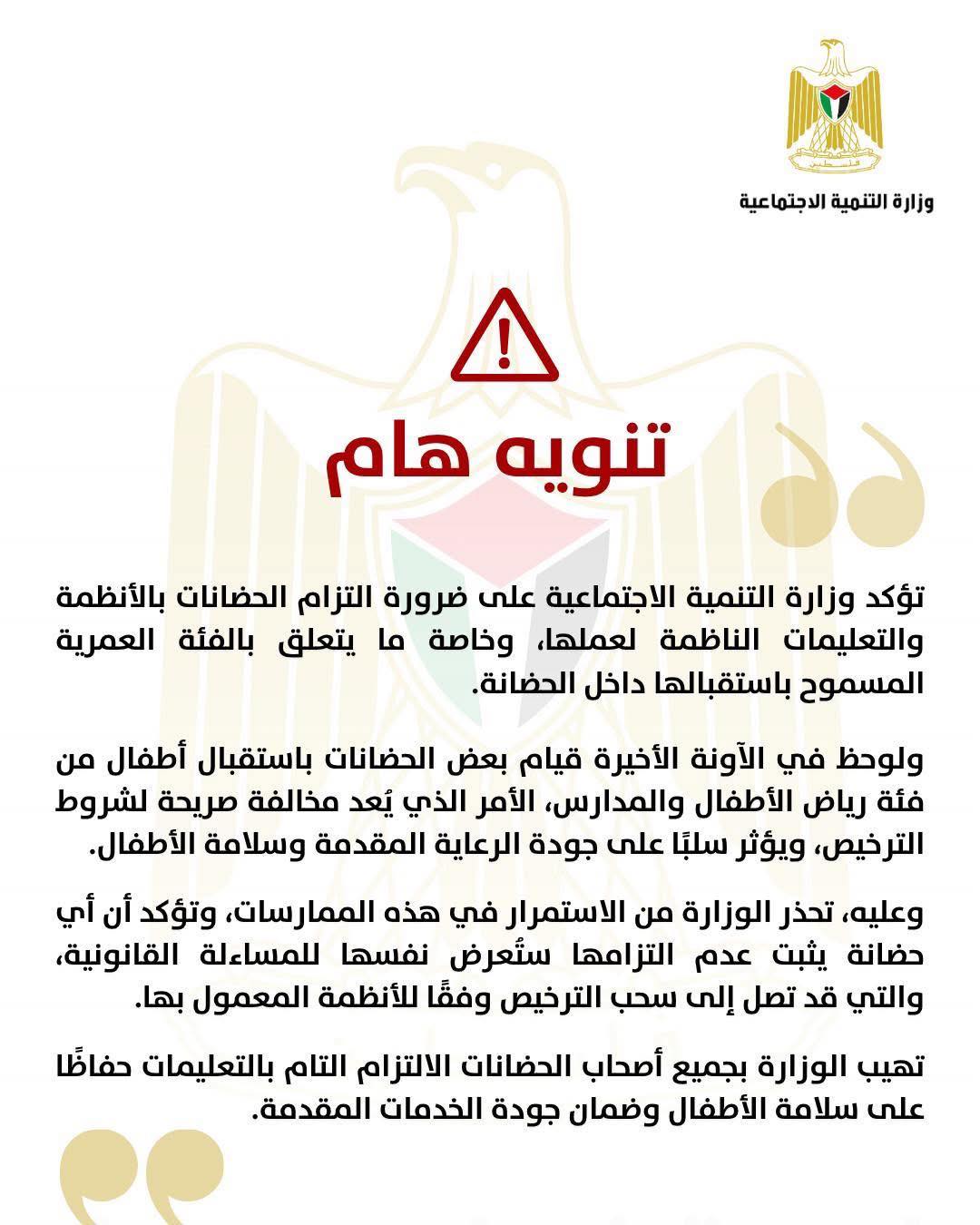 النجاح الإخباري - أكدت وزارة التنمية الاجتماعية الفلسطينية ضرورة التزام الحضانات بالأنظمة والتعليمات الناظمة لعملها، خصوصاً ما يتعلق بالفئة العمرية المسموح باستقبالها داخل الحضانة.