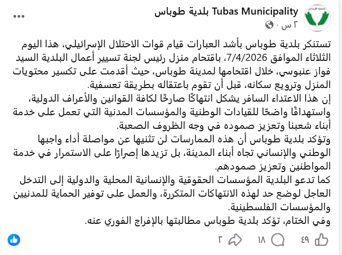 وفي سياق متصل، استنكرت بلدية طوباس اعتقال رئيس لجنة تسيير أعمال البلدية فواز عنبوسي، عقب مداهمة منزله تخريب محتوياته وترويع سكانه.