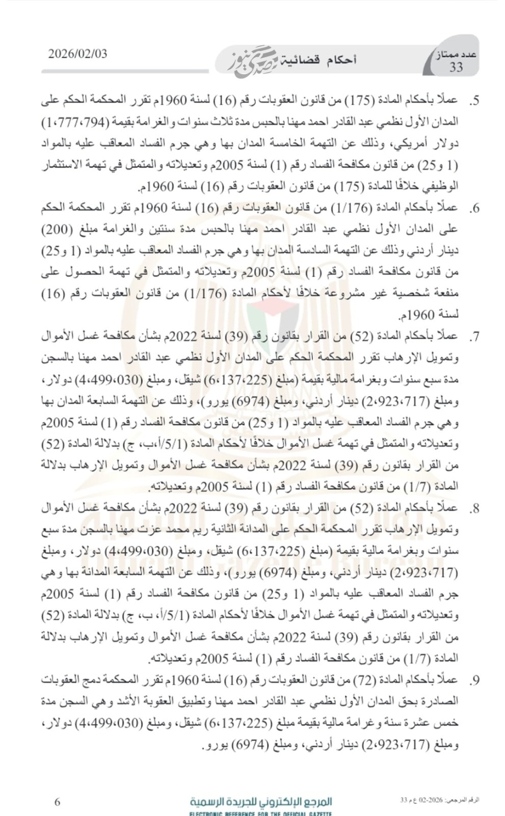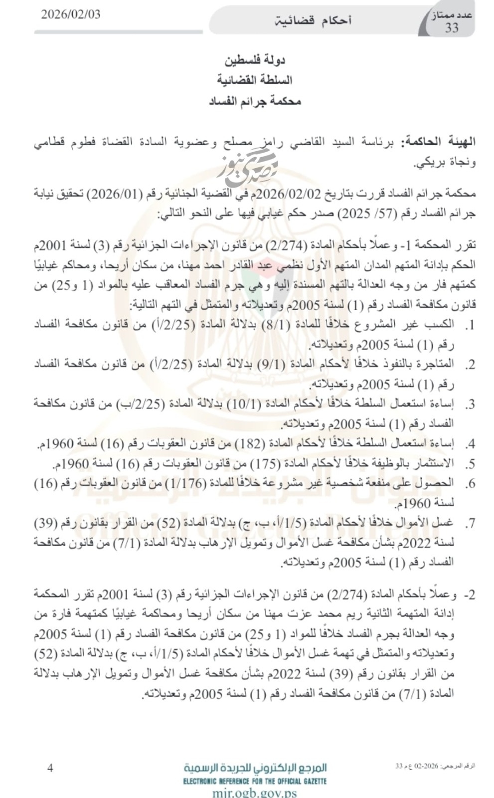وشمل الحكم كذلك مصادرة الأموال المنقولة وغير المنقولة المتحصلة عن جرائم الفساد، بما في ذلك العقارات والأرصدة المالية داخل فلسطين، وفي كل من الأردن والإمارات العربية المتحدة، وحرمان المحكوم عليهما من التصرف بها، تمهيدًا لنقل ملكيتها إلى الخزينة العامة وفق الإجراءات القانونية المعتمدة.