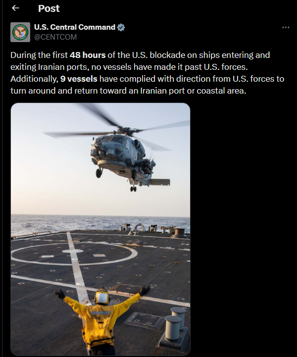 وكالات - النجاح الإخباري - قال الجيش الأمريكي اليوم الأربعاء إن تسع سفن امتثلت لتوجيهات القوات الأمريكية بالعودة باتجاه إيران خلال الحصار المفروض على الموانئ الإيرانية.