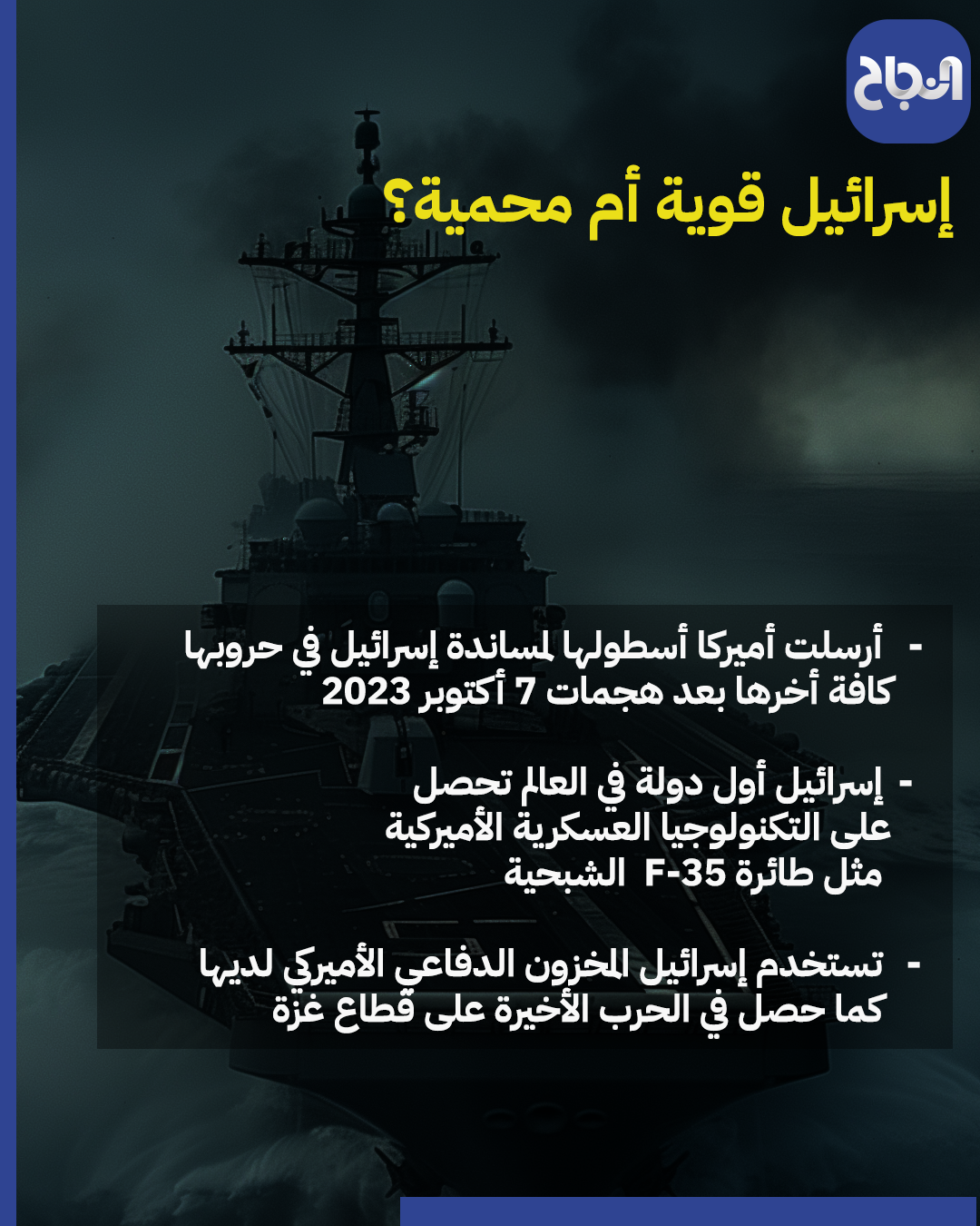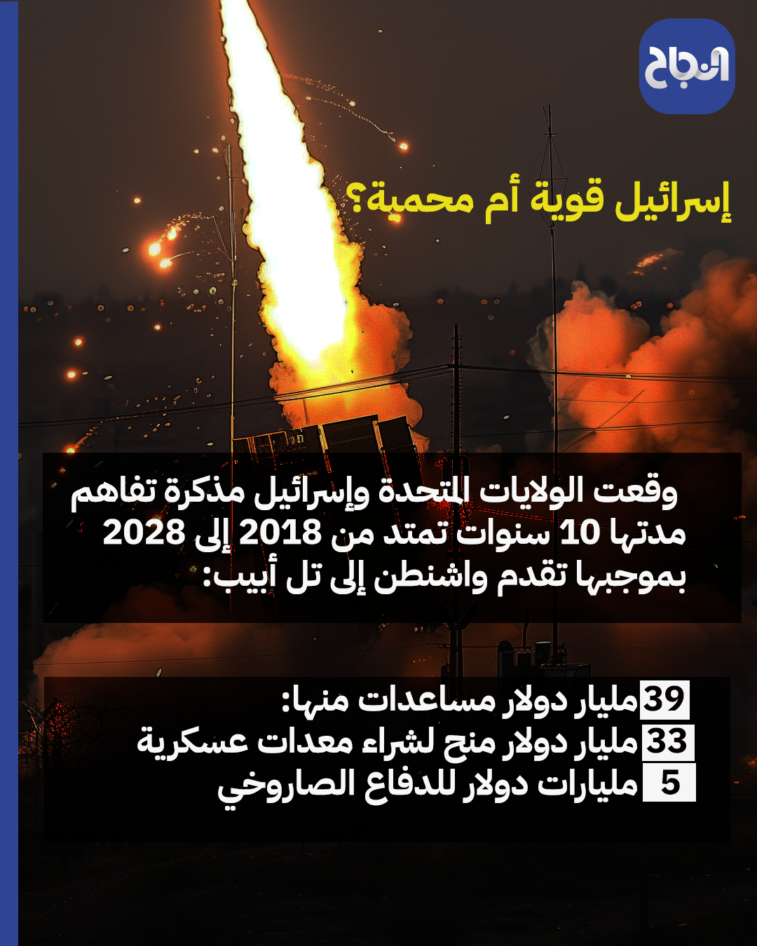 النجاح الإخباري - تعهد الرئيس الأميركي جو بايدن بدعم "صارم" لإسرائيل بعد أن عقد اجتماعا عاجلا ضم كبار المسؤولين الأمنيين، وذلك على خلفية الهجوم الإيراني على إسرائيل ليلة أمس، إليكم انفوجرافيك يبين الدعم العسكري الذي تتلقاه إسرائيل من الولايات المتحدة.