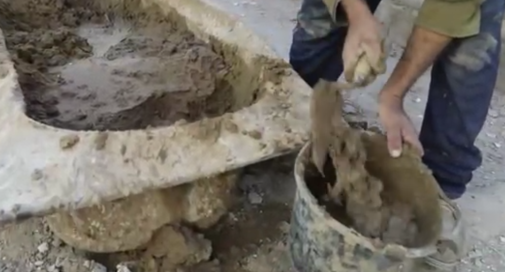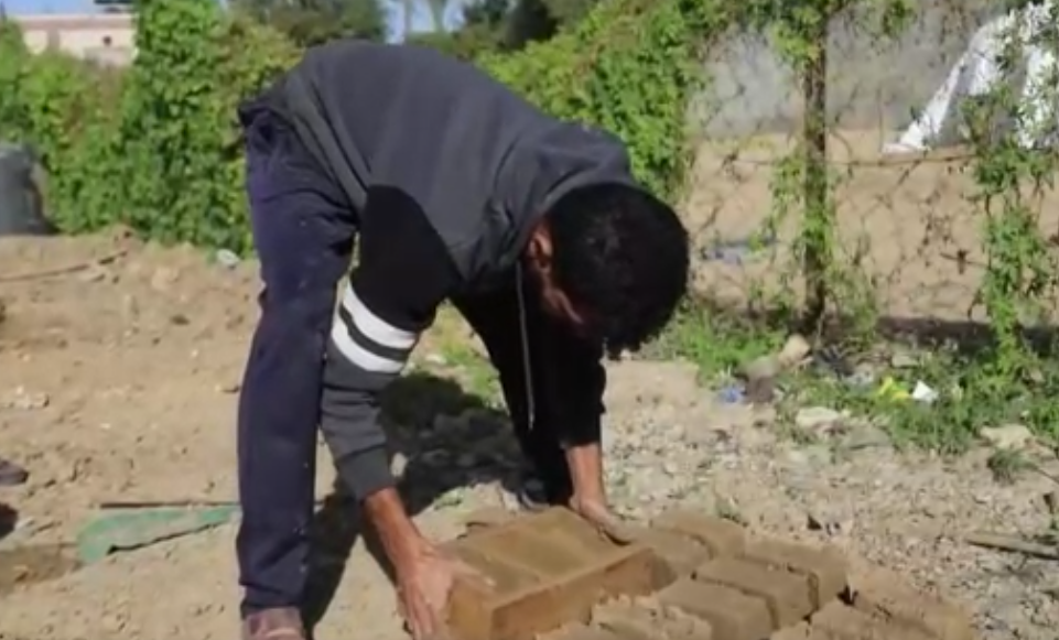 جعفر عطالله، نازح من حي التفاح في مدينة غزة ويعيش حاليًا في الزوايدة وسط القطاع، كان يعمل سابقًا في صناعة الفخار، ويستعين اليوم بمهاراته في تشكيل الطين لصنع قوالب طينية وبناء غرفة صغيرة تُؤوي عائلته.